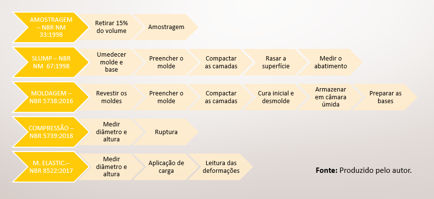 Na figura abaixo vemos os principais passos a serem seguidos, de acordo com as normas técnicas vigentes, para ensaios de concreto fresco e endurecido.